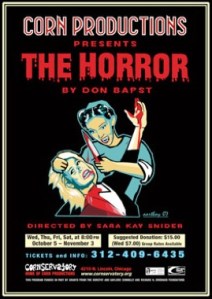 The Horror was first staged as a reading directed by Richard Shavzin* at Chicago Dramatists as part of The Saturday Series, February 12, 2005, featuring Scott Antonucci*, Aaron Christensen*, Wendye Clarendon*, Jennifer Estlin*, Deb Goldstein*, Brandy McClendon*, Mike McNamara, and Vance Smith.